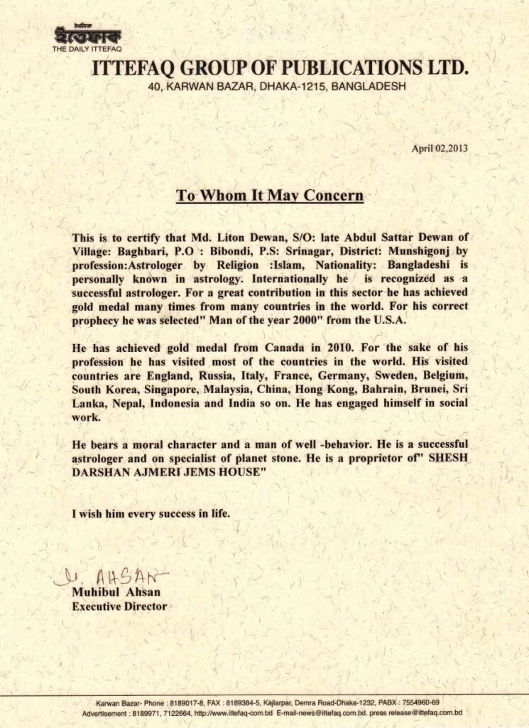 "তার দেওয়া পরামর্শে আংটি ব্যবহার করে এখন আমার আর্থিক, সামাজিক ও পারিবারিক সমস্যা দূর হয়েছে।"