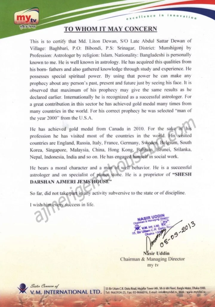 ব্যক্তি জীবনের সকল অস্থিরতা ও হতাশাগ্রস্থ জীবন থেকে মুক্তি পেতে সনামধন্য জ্যোতিষরাজ লিটন দেওয়ান চিশতী সাহেবের দর্শনে আসুন। সঠিকভাবে সঠিক রত্নপাথর কিনতে আজই চলে আসুন "আজমেরী জেমস হাউজে "। আমরা আমাদের প্রত্যেকটি রত্নপাথরে ১০০% অরিজিনাল নিশ্চয়তা দিয়ে থাকি।