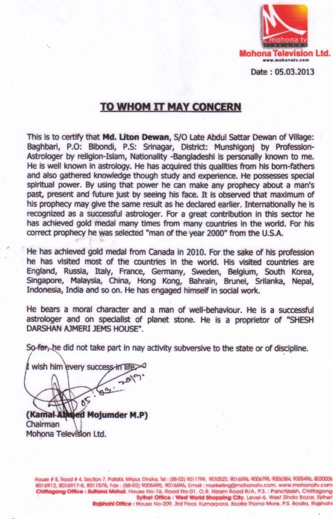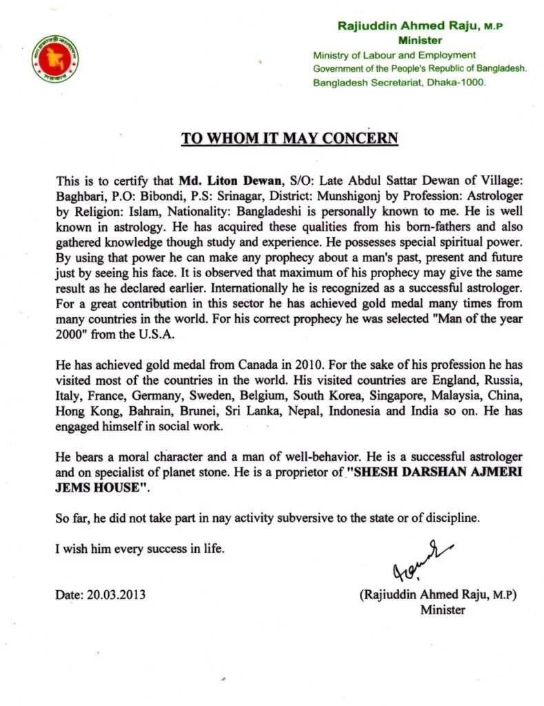 "আমি অনেক সমস্যায় ভুগেছিলাম। তার দেয়া আংটি ব্যবহার করে অনেক সুফল পেয়েছি ।"