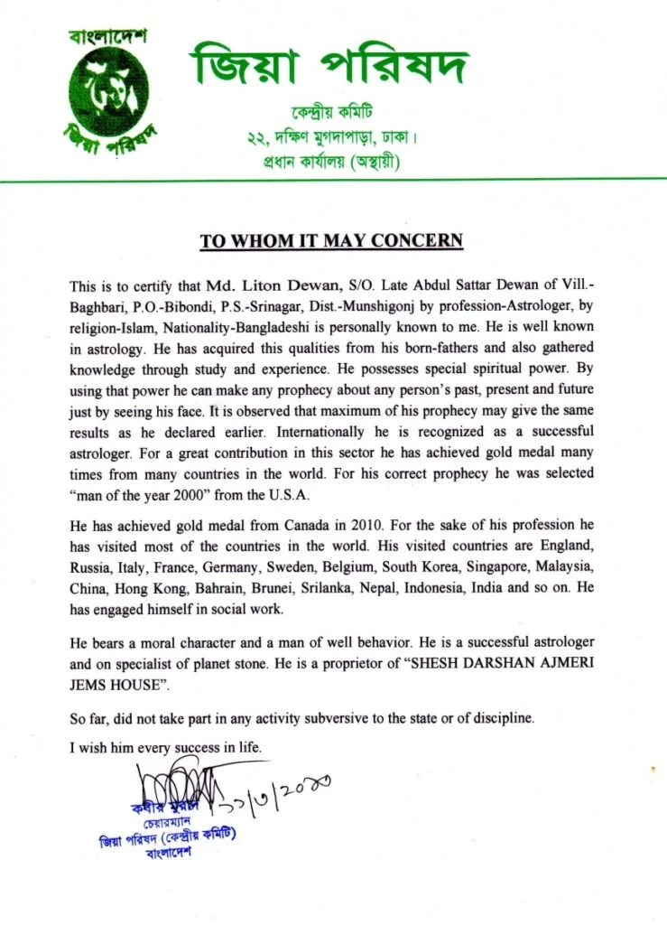 ব্যক্তি জীবনের সকল অস্থিরতা ও হতাশাগ্রস্থ জীবন থেকে মুক্তি পেতে সনামধন্য জ্যোতিষরাজ লিটন দেওয়ান চিশতী সাহেবের দর্শনে আসুন। আমরা আমাদের প্রত্যেকটি রত্নপাথরে ১০০% অরিজিনাল নিশ্চয়তা দিয়ে থাকি। সুস্থ থাকুন, নিজেকে এবং পরিবারকে ভালোবাসুন। কারচুপি, প্রতারণা থেকে বাঁচতে সঠিকভাবে সঠিক রত্নপাথর কিনতে চাইলে আজই চলে আসুন "আজমেরী জেমস হাউজে"। জ্যোতিষরাজ লিটন দেওয়ান ৩০ বছর যাবৎ চিশতীয় জ্ঞানের অনুশীলন করে সঠিক পথ অনুসরণের মাধ্যমে জীবনযাত্রা, হৃদয়পথ, শিরোনাম এবং ভাগ্য রেখা নিয়ে বিভিন্ন দিক নির্দেশনা দিয়ে যাচ্ছেন। দেশ ও দেশের বাহিরে খুব অল্প সময়ে বেশ সুনাম অর্জন করেছেন নিজের দক্ষতা ও জ্যোতিষ জ্ঞান দিয়ে পেয়েছেন গুণীজন সংবর্ধনা এবং বিভিন্ন সংবাদপত্র ও গণমাধ্যম থেকে দেওয়া সম্মাননা সনদপত্র। রত্নপাথরের সুফল জানতে মহাজ্যোতিষরাজ লিটন দেওয়ান চিশতী সাহেবের সাথে পরামর্শ করুন।