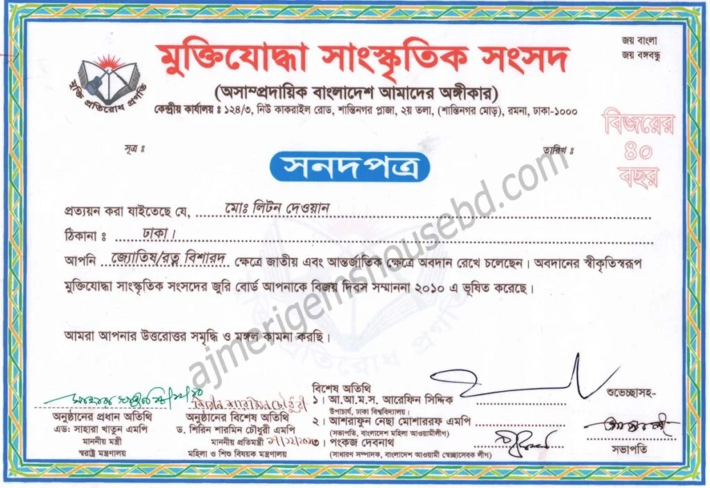 অনেক দেশবরেণ্য রাজনীতিবীদ, মন্ত্রী, এমপি, বিচারপতি, সরকারী কর্মকর্তা, শিল্পপতি-ব্যবসায়ীসহ বিভিন্ন শ্রেণি পেশার মানুষ লিটন দেওয়ান চিশতির পরামর্শ, দিকনিদের্শনা ও তার কাছ থেকে রত্নপাথর ব্যবহার করে সুফল লাভের পর তাকে সনদ প্রদান করেছেন। তার পরামর্শ, নির্দেশনা ও পরামর্শে লাখ লাখ মানুষ উপকৃত হন।